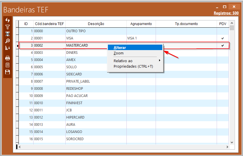 Caso deseje alterar as configurações de uma bandeira, basta selecionar a opção “Alterar” no menu de contexto.