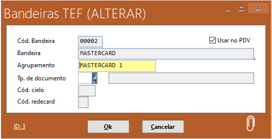 Na tela que se abrirá, temos a opção de definir um agrupamento para a bandeira. O campo em questão é livre, então poderá criar um termo para agrupar essa e diversas outras bandeiras com esse mesmo termo criado (exemplo: Loja 01). Também existe a opção de selecionar um tipo de documento que será vinculado a essa bandeira, como cartão de crédito, por exemplo. E por fim, podemos marcar a caixa “Usar no PDV”, caso deseje que essa bandeira seja utilizada nas transações feitas pelo Vixen PDV.