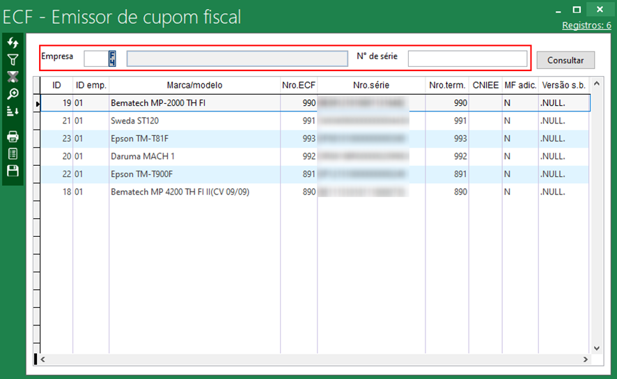 Para realizarmos uma consulta e encontrar uma ECF específica já cadastrada no sistema, devemos preencher alguns campos: