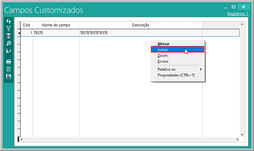 Para realizarmos a inclusão de um campo customizados iremos clicar com o botão direito na tela, assim será aberto o menu de opções e clicar na opção “incluir”.