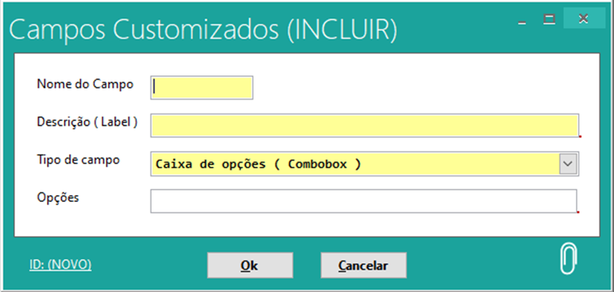 Opções -> Caso selecionemos o tipo de campo “Caixa de opções (Combobox) teremos que digitar quais as opções a serem exibidas.