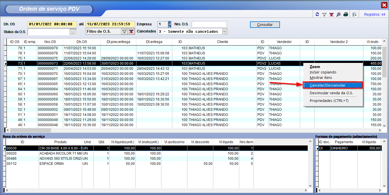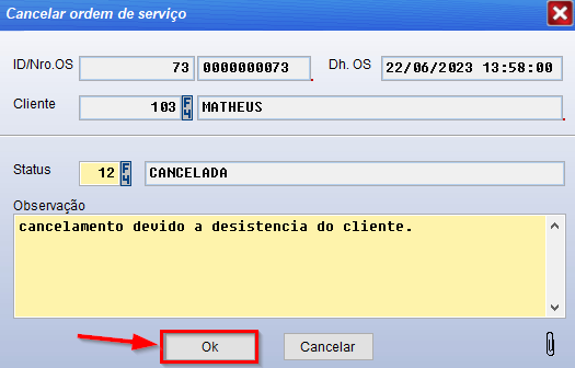 Obs. caso precise remover o cancelamento de uma O.S faça o mesmo processo para surtir efeito.