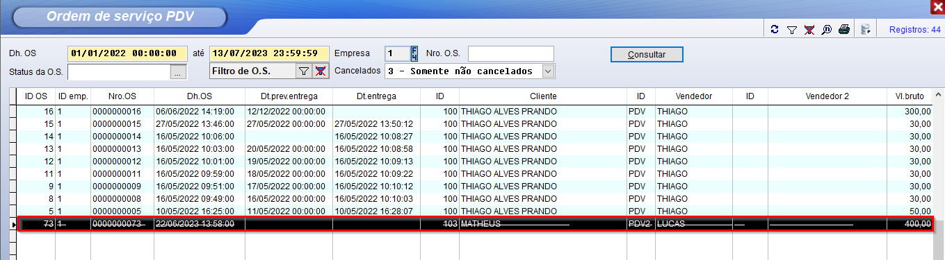 Pronto, o processo de cancelamento de uma Ordem de serviço foi concluído com êxito. Abaixo vemos que a O.S será marcada com um risco indicando que a mesma esta cancelada.