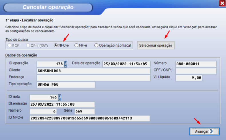 Assim que selecionada a operação, abaixo irá ser exibido os dados daquela venda, para validação e confirmação. Após isso, clicar em “Avançar”.