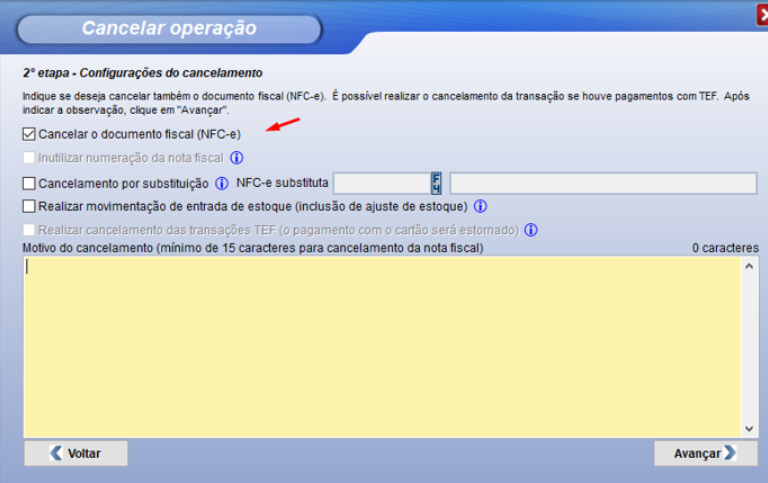 É possível realizar o cancelamento da transação em cartão se houver pagamentos com o TEF, digite o motivo do cancelamento e clique em “Avançar”.