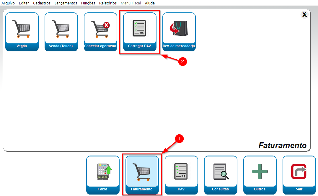 Para faturar uma DAV será necessário seguir os seguintes passos, primeiro na grade do menu inicial do Vixen abra a opção Faturamento e em seguida selecione a opção Carregar DAV. Após isso, ira subir a tela de Carregar DAV basta selecionar a DAV que deseja efetuar o faturamento, caso não tenha a numeração basta efetuar uma busca pelos filtros que a tela Carregar DAV são eles: Nro. DAV, Cliente e Previsão de entrega.