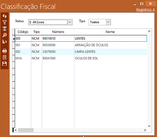 Ao acessar a tela “Classificação fiscal” serão exibidas as classificações fiscais que já estão cadastrados em nosso sistema: