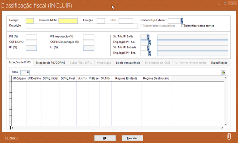 Ao preencher as informações obrigatórias, basta selecionar o botão “Ok” para finalizar o cadastro da nova classificação fiscal.