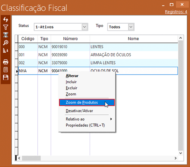 Existe também a possibilidade de consultar quais os produtos estão vinculados a uma determinada classificação fiscal. Para realizar essa consulta, em cima da classificação fiscal desejada, clicamos com o botão direito do mouse, e selecionar a opção “Zoom de produtos”: