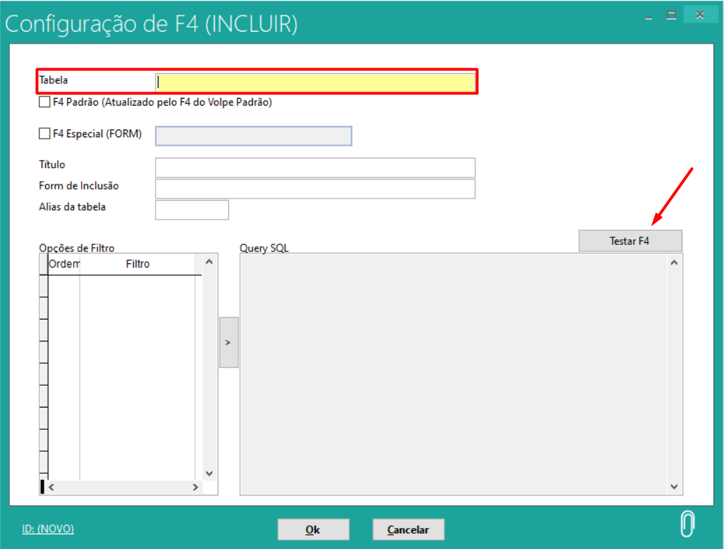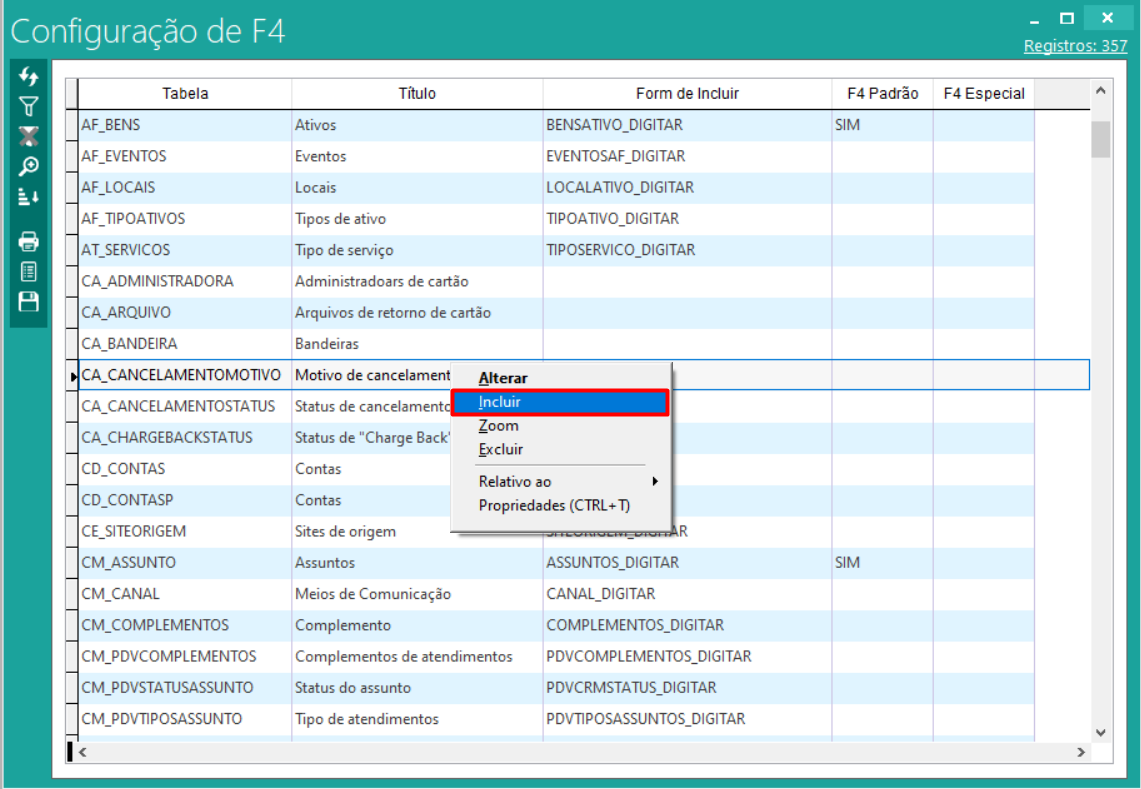Para incluir um novo, basta clicar com o botão direito do mouse, e selecionar o a opção “incluir”, depois preencher as informações no campo “QuerySQL” para que seja realizado a inclusão do novo F4: