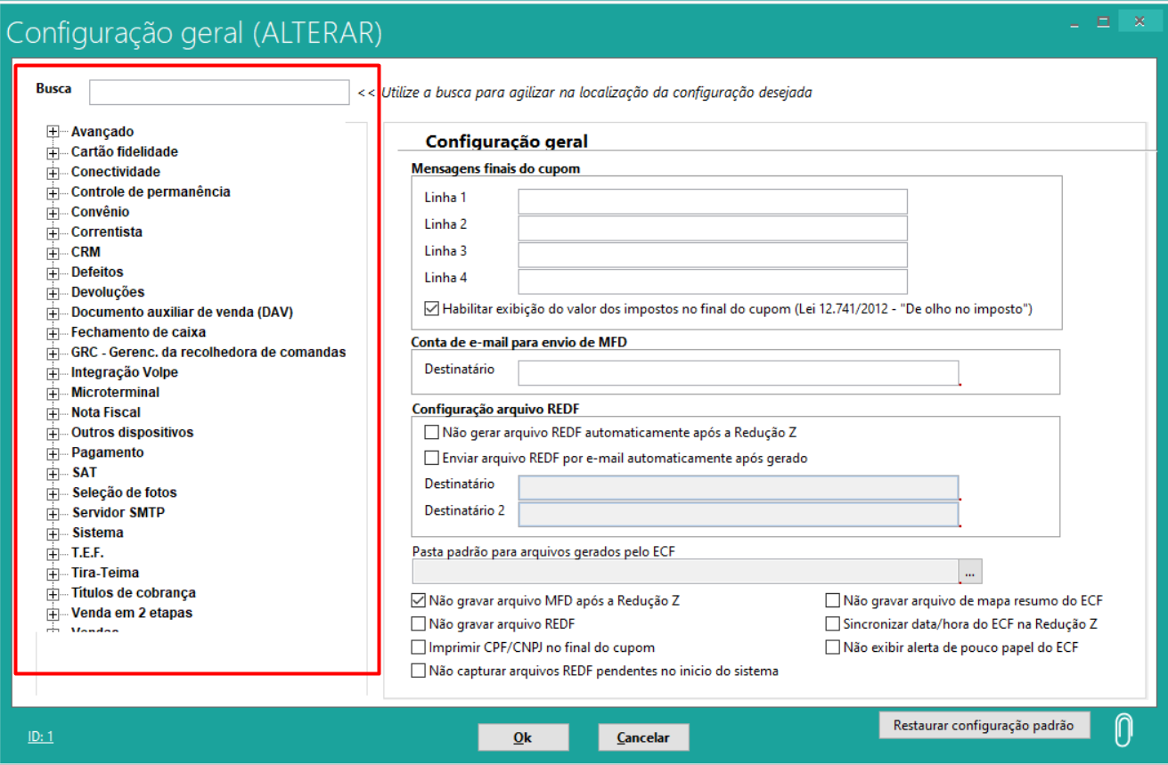 A configuração geral é a tela onde fazemos a configuração gerais do sistema, alteramos configurações de pagamentos, configurações do PDV e do Volpe.