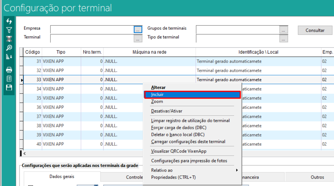 Ao acessar a tela em questão, vamos nos deparar com uma lista com todos os terminais cadastrados no sistema. Para realizar a inclusão de um novo, basta clicar com o botão direito do mouse, e selecionar a opção “incluir” no menu de contexto que irá se abrir.