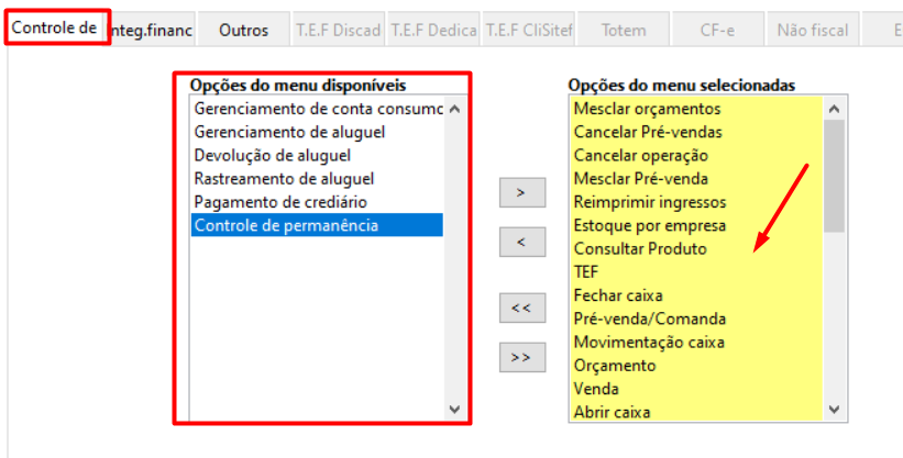 Na aba Controle de Sistema, definimos quais os módulos aquele terminal terá disponível para uso. É possível selecionar arrastando o módulo para o lado direito.