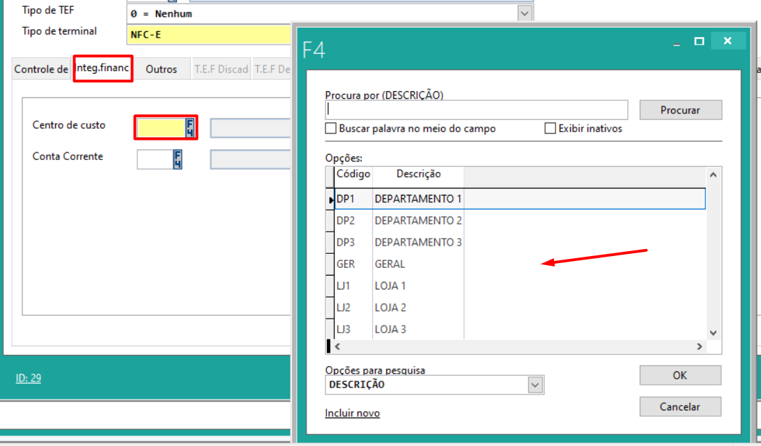 Na guia “Integração Financeira” seleciona-se o centro de custo do terminal e a conta corrente utilizada para a realização das transações financeiras.