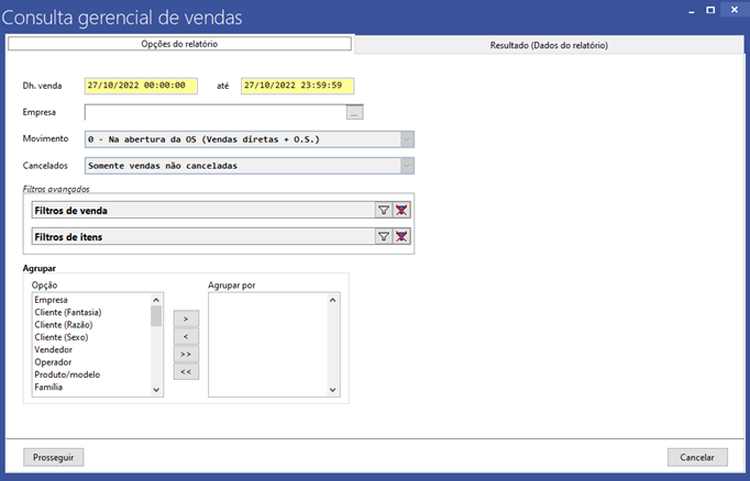 Agrupar: Seleciona como o relatório irá filtrar as informações, de acordo com as opções de agrupamento disponíveis