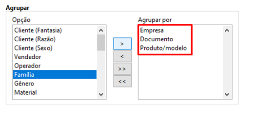 O principal diferencial desse relatório é justamente a possibilidade de agrupar as informações de diversas formas. Então caso necessário, podemos personalizar o resultado, onde queremos apenas saber o quanto a empresa lucrou, suas vendas e respectivos produtos vendidos. Para isso, basta agrupar as informações por “Empresa”, “Documentos” e “Produto/modelo”, conforme vemos abaixo: