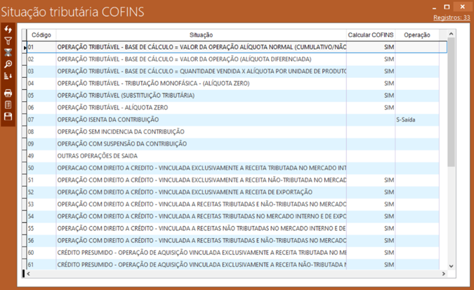 Ao abrir a tela em questão, vamos nos deparar com uma lista de todas as situações tributarias do COFINS já cadastradas no sistema: