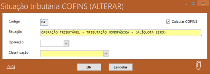 Após isso, basta clicar em “Ok” para finalizar o cadastro daquela nova situação tributária de PIS no sistema.
