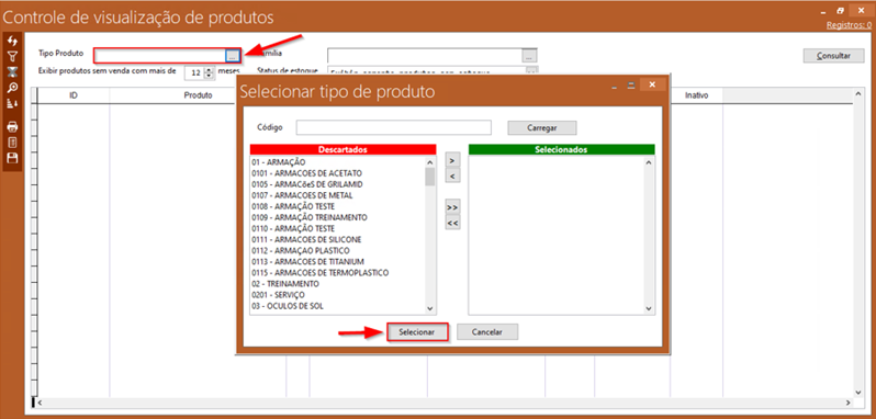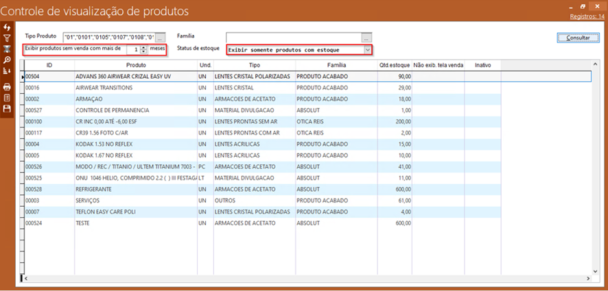 O controle de visualização de produtos é utilizado para extrair informações de uma relação de produtos que estão sem vendas. Selecionando por tipo de produto e famílias, escolhendo o status de estoque ou um determinado produto, é possível saber quais produtos estão em estoque e quantos meses estão sem saída para venda.