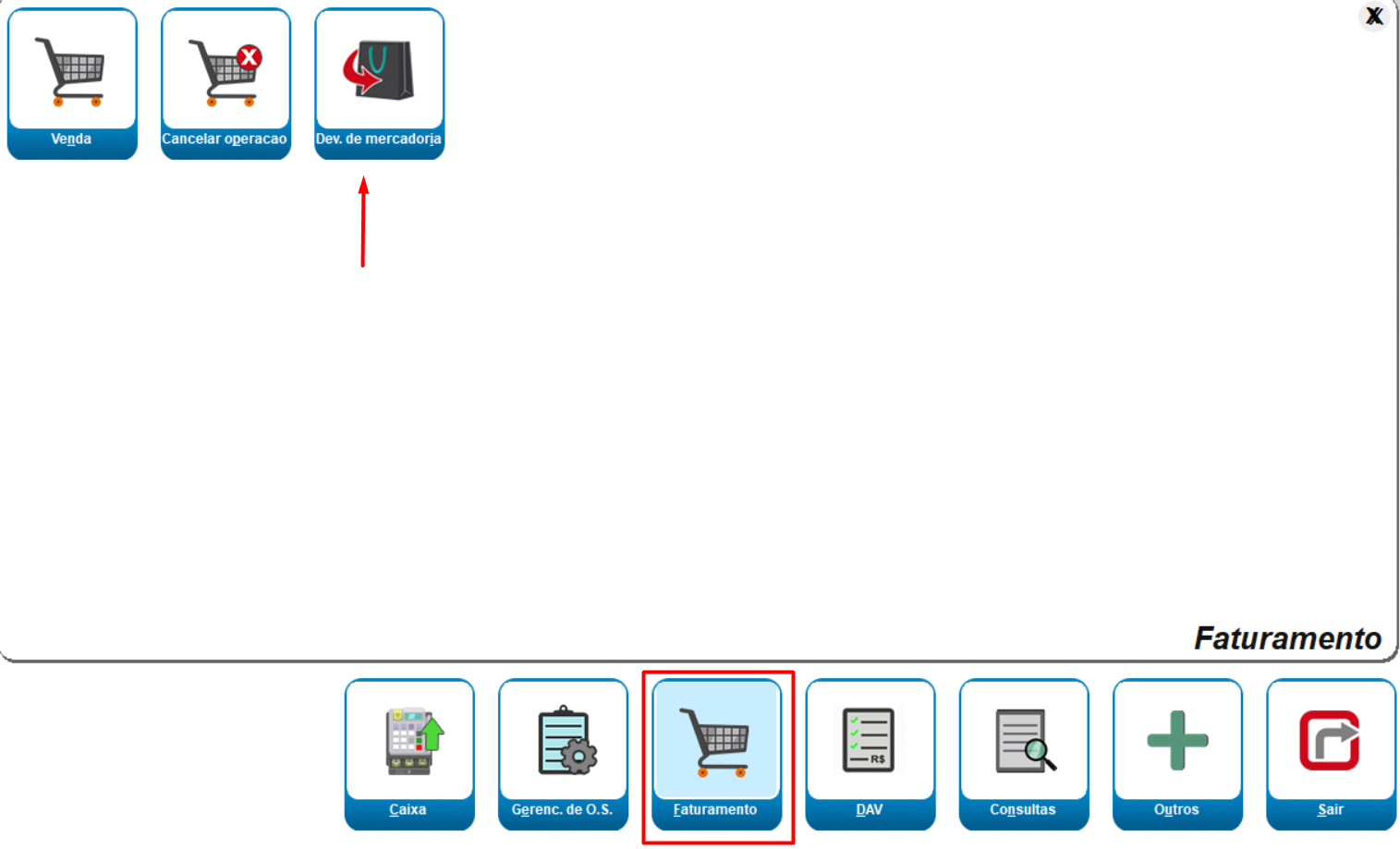 Para realizarmos essa operação, basta entrar no módulo de Faturamento e ir em Devolução de Mercadorias, conforme mostra na imagem abaixo: