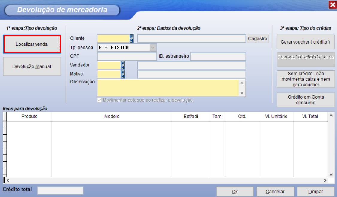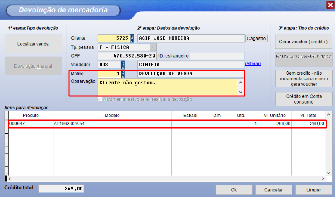 Sem crédito Não movimenta caixa e não gera voucher Neste caso, o processo apenas registra a devolução, e ajusta o estoque dos produtos.
