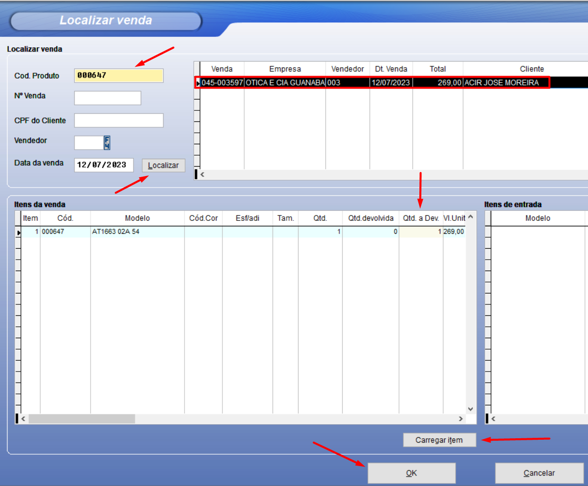 Localizar no sistema a venda que foi feita, para poder listar os itens.