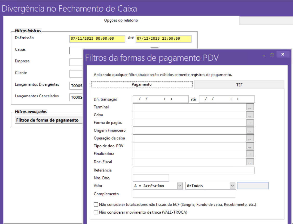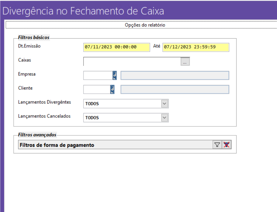 Volpe ERP > Retaguarda ótica > Divergência no Fechamento de Caixa. > Filtros de Forma de Pagamento