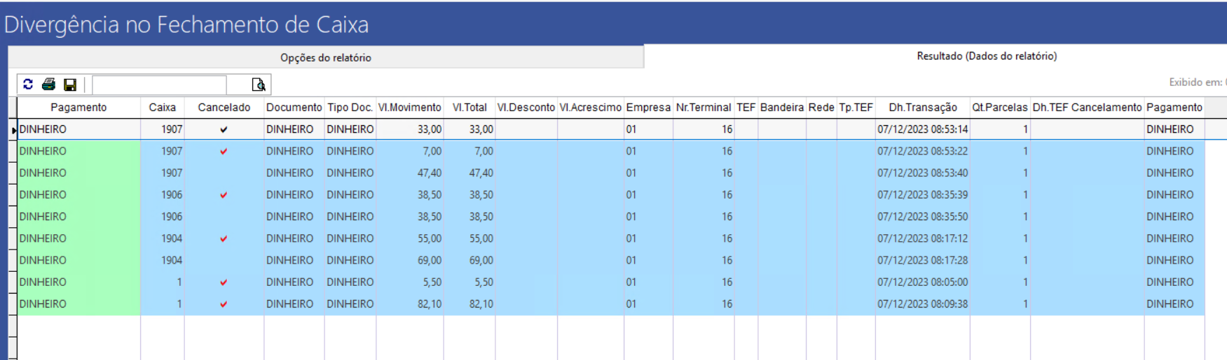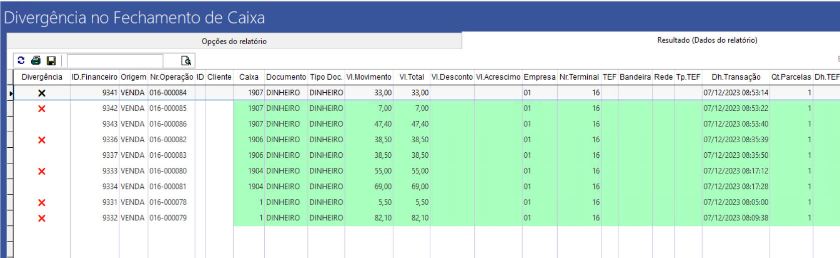 Volpe ERP > Retaguarda ótica > Divergência no Fechamento de Caixa > Resultado (Dados do Relatório)
