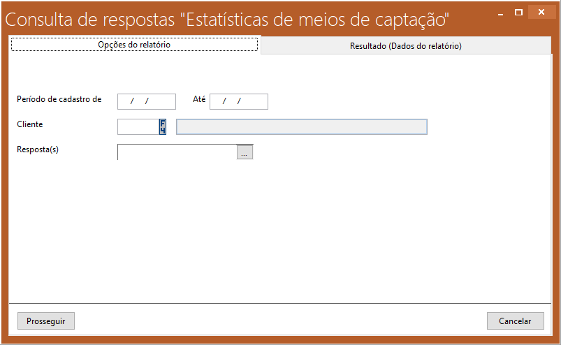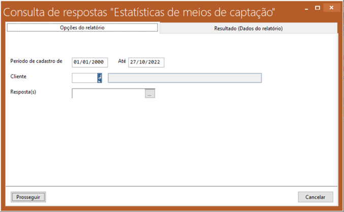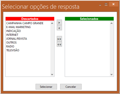 Resposta -> Neste campo podemos selecionar conforme desejar, alguns meios de captação para serem exibidos no relatório, conforme podemos ver abaixo na tela “Selecionar opções de resposta "