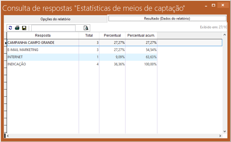 Percentual -> Esta coluna irá exibir a porcentagem de clientes cadastrados em determinado meio de captação, lembrando que esta divisão é feita entre todos os meios de captação, ou seja, dentro de um relatório todos irão somar 100%.