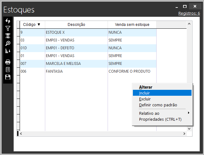Para incluir um novo, basta clicar com o botão direito do mouse, e selecionar a opção “incluir” no menu de contexto que irá se abrir. Em seguida, devemos preencher algumas informações: