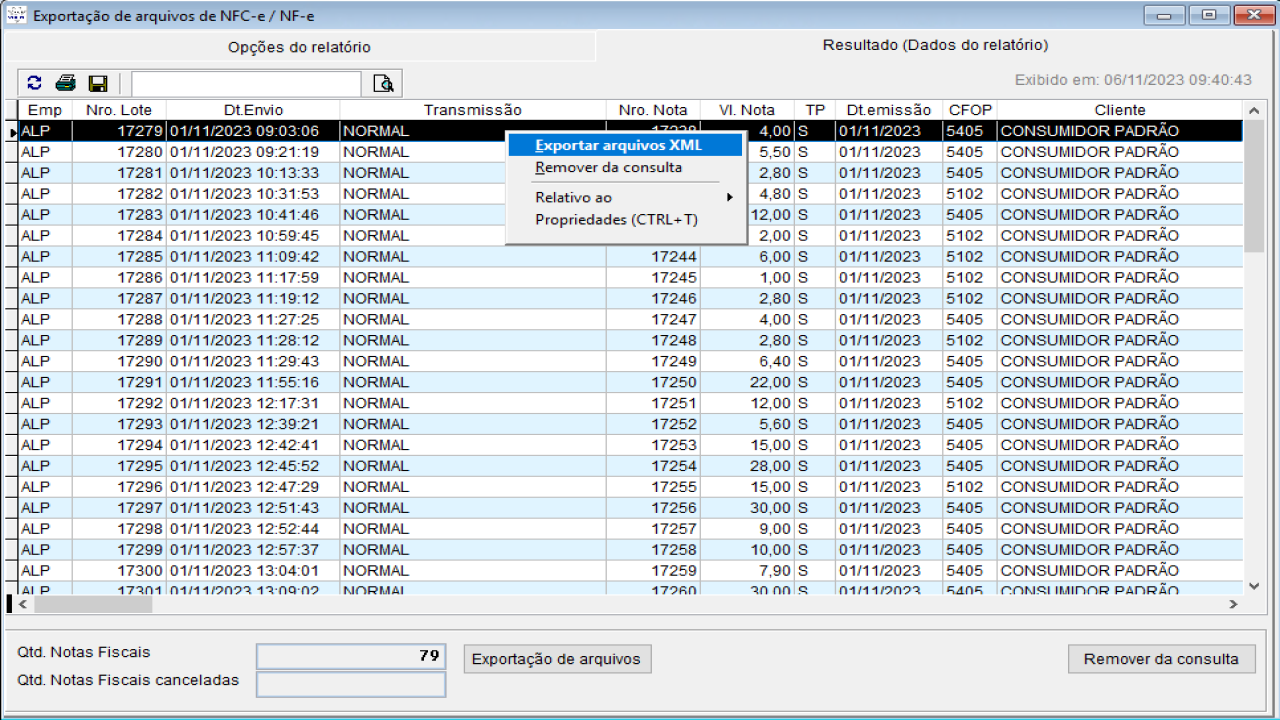 Já na tela com os resultados da pesquisa, com o botão direito na grade clique na opção “Exportar arquivos XML”.