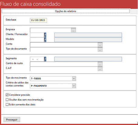 Ao abrir a tela em questão, vamos nos deparar com alguns campos que serão necessários preencher para a filtragem dos dados: