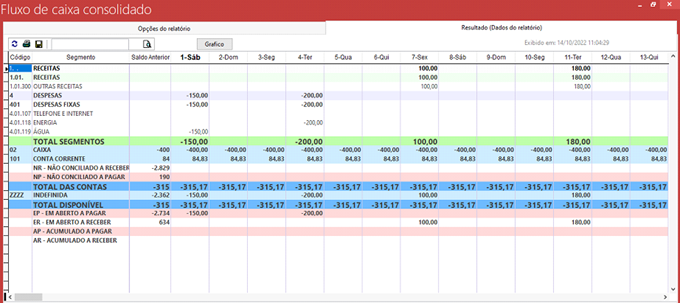O “Fluxo de caixa consolidado” exibe todos os caixas que, durante o período filtrado tiveram alguma movimentação, desde aberta e fechamento, até sangrias e fundos de caixa.