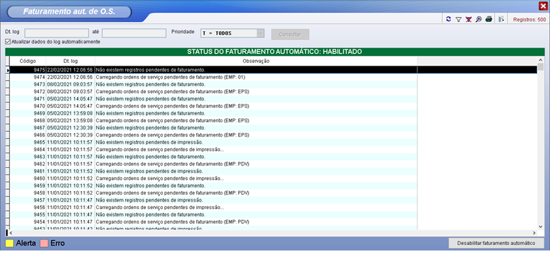 Na seção de Faturamento automático de OS, podemos visualizar os Logs de faturamento.