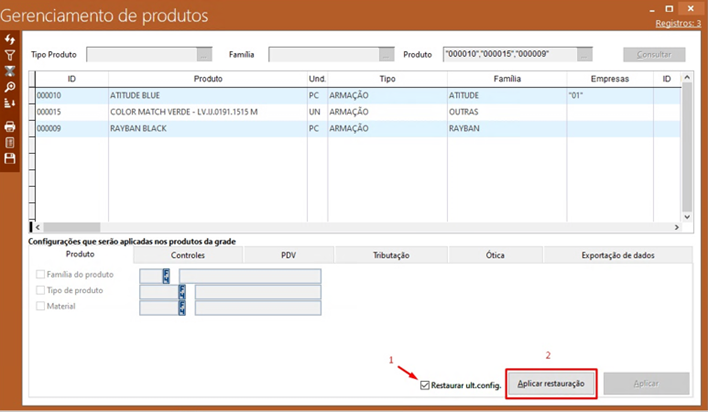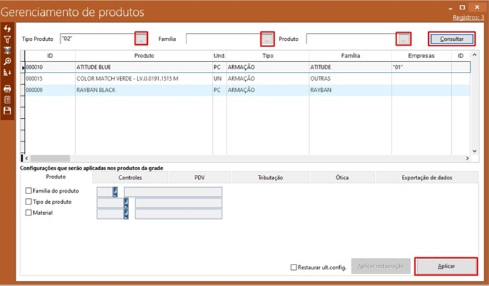 Ao abrir a tela, vamos nos deparar com alguns campos de filtragem no topo dela. Nela é possível filtrar os produtos que desejar aplicar a configuração através do seu tipo ou família. E no caso de produtos de diferentes grupos, também é possível filtrar um a um: