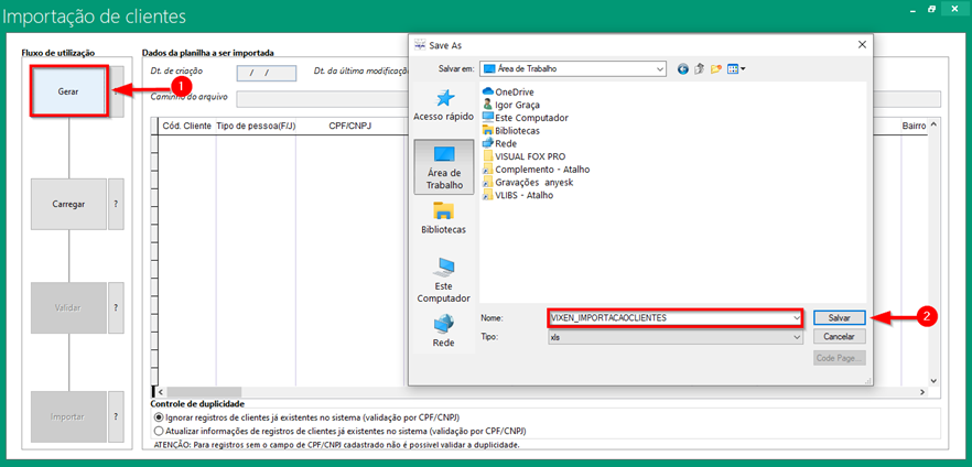 O primeiro passo é gerar uma planilha no padrão que o nosso banco de dados enxerga os campos para isso será necessário exportar uma planilha em Excel no formato padrão do sistema com os campos e colunas para serem preenchidos na tela inicial clique em Gerar para salvar o arquivo em seu computador.