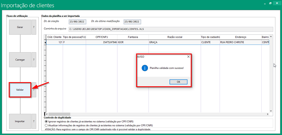O terceiro passo é validar se os dados preenchidos estão corretos ao clicar em validar o sistema irá apresentar essa mensagem Planilha validada com sucesso