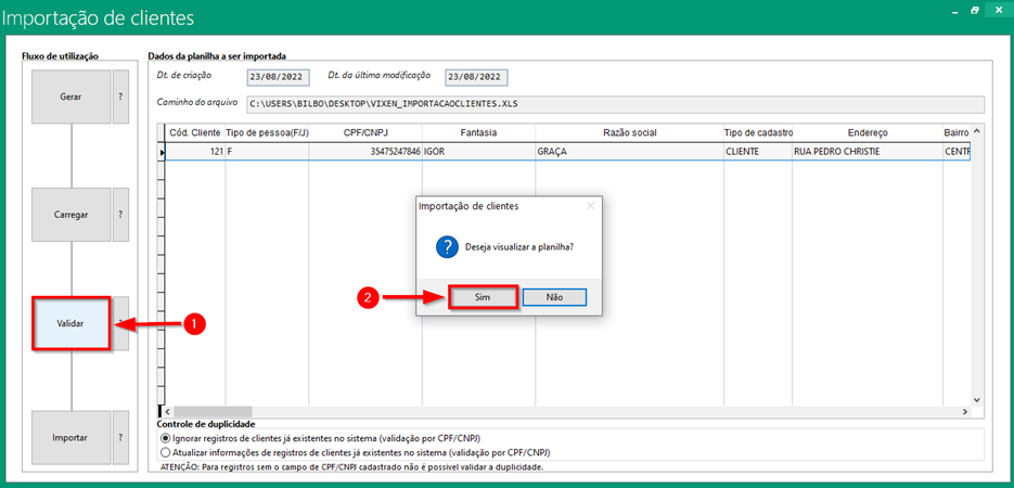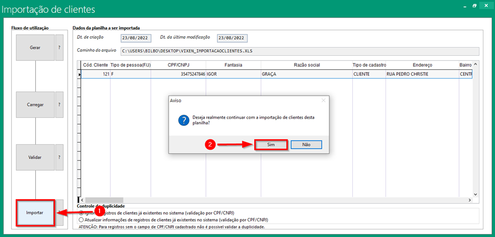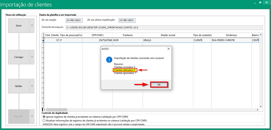 Nessa etapa o sistema irá abrir o Excel e caso tenha algum campo invalido na planilha, o sistema vai informar quais campos precisam ser corrigidos ou obrigatoriamente preenchidos. Refaça o processo e após o sistema não reportar mais erro, o sistema irá liberar o ultimo campo de importar basta finalizar a importação dos clientes no sistema.