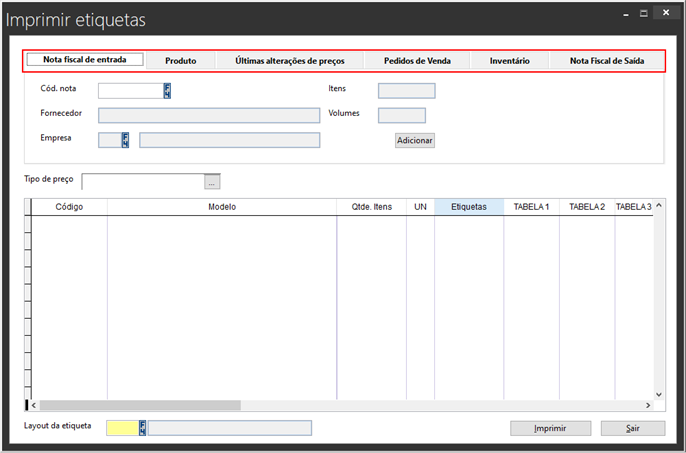 Ao abrir a tela, você tem algumas guias para facilitar na impressão de uma ou mais etiquetas de uma só vez, abaixo irei explicar principalmente as guias de Nota fiscal de entrada e a guia de Produto: