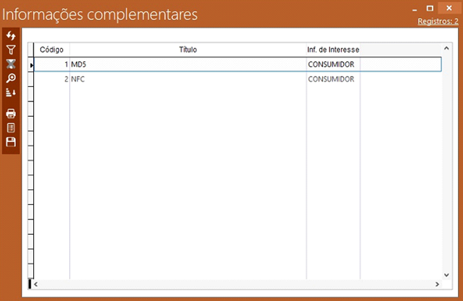 Ao abrir a tela em questão, vamos nos deparar com uma lista de informações complementares já criadas: