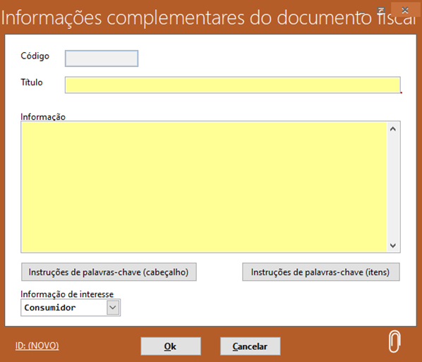 É possível cadastrar novas informações complementares, bem como alterar as que já estão cadastradas. Para cadastrar uma nova informação complementar, basta clicar com o botão direito do mouse e selecionar a opção “incluir” no menu de contexto que irá se abrir. Em seguida, será aberta uma nova tela, onde será necessário preencher algumas informações: