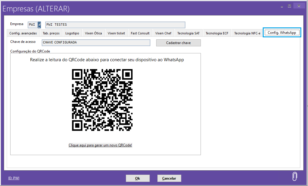 Retaguarda Ótica > Configurações por Empresa > Alterar > Config. WhatsApp > Cadastrar Chave