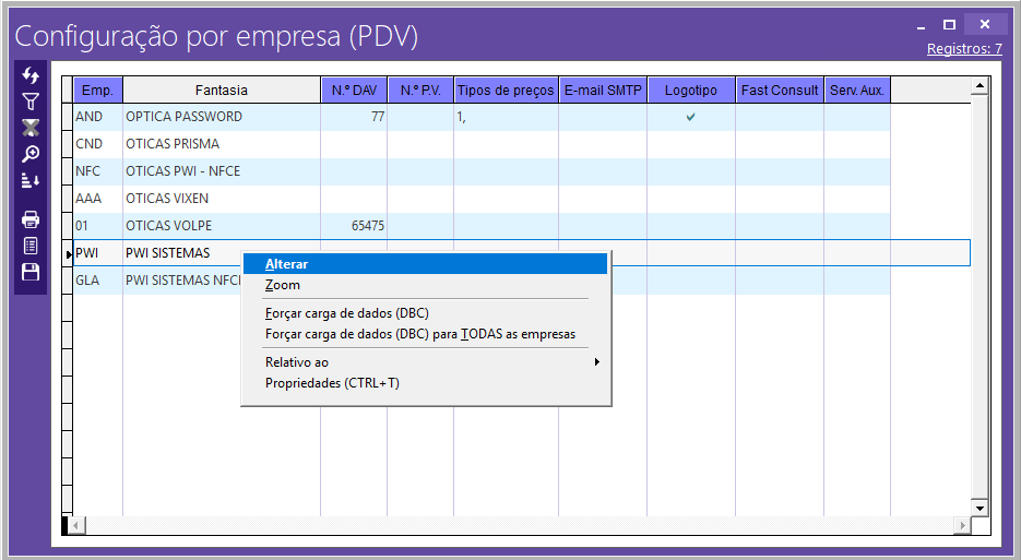 Clique duas vezes no registro de sua empresa, ou use o botão direito > Alterar. E então siga até a aba Config WhatsApp.