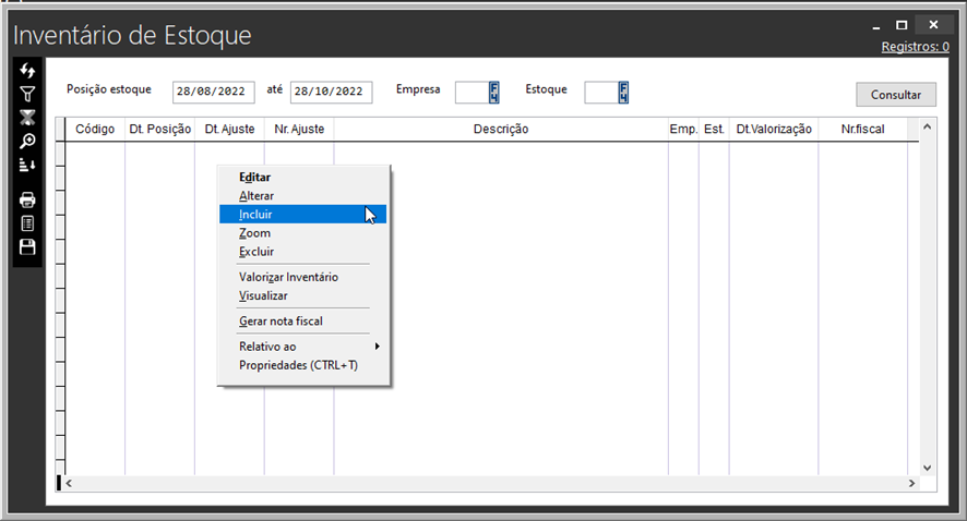 Para incluir um novo inventário de estoque, é necessário clicar com o botão direito e depois em selecionar a opção “incluir”: