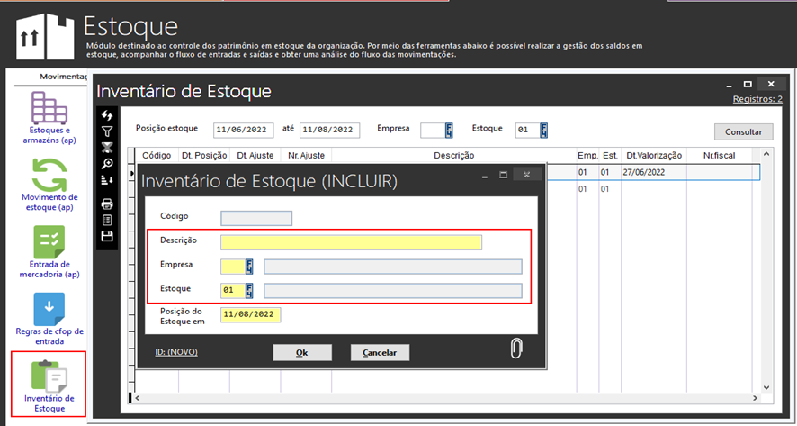 Com isso é preciso informar uma descrição do inventario que está sendo criado, assim como a empresa e o estoque que será alterado: