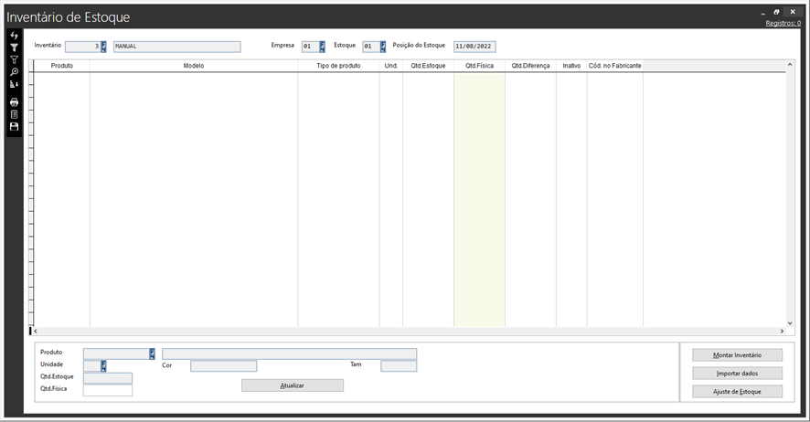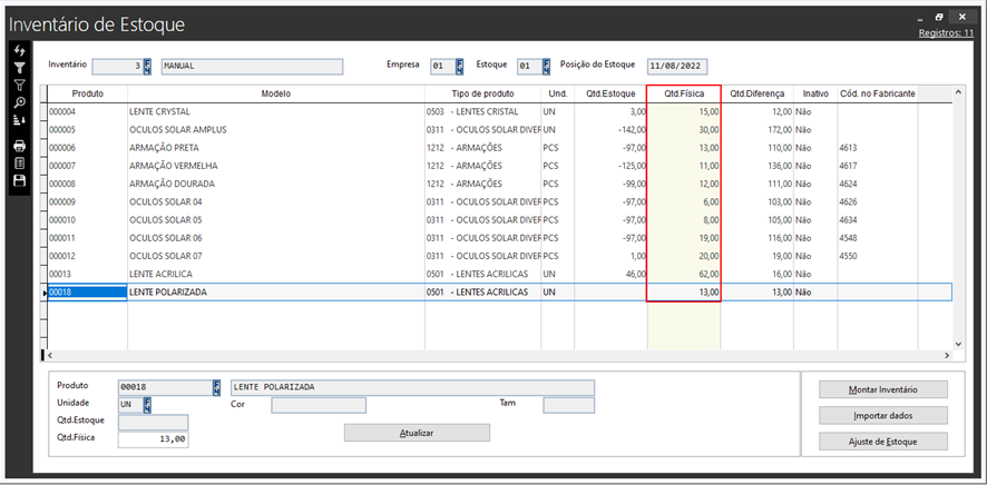 Após realizar a montagem, os produtos vão aparecer na grade permitindo no campo em amarelo definir a quantidade atual que se encontra no seu estoque físico.