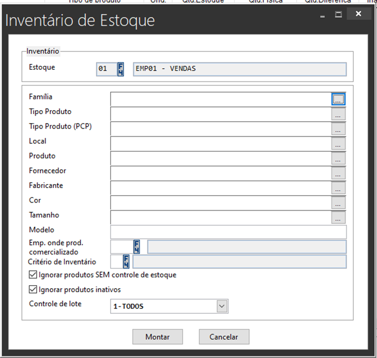 Após criado o novo inventário, será necessário estar montando a grade dos produtos que vão ser editados, é possível estar fazendo isso clicando no botão de “Montar Inventario” e então utilizar os filtros para trazer os produtos que você queira: