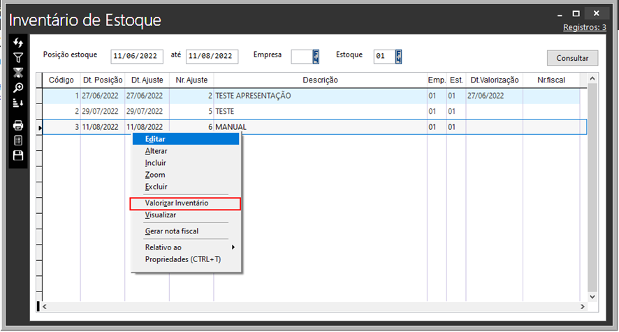 Aqui, você pode clicar em “Gerar ajuste de estoque”, após isso você pode voltar para a tela de busca dos inventários, para estar aplicando todas as alterações, precisa clicar com o botão direito e então em “Valorizar Inventário”