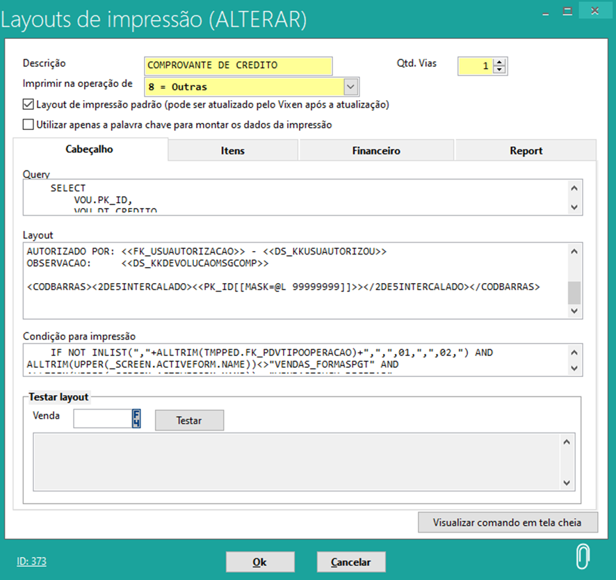 Layout de impressão padrão -> Define se a palavra-chave da impressão pode ser atualizada junto ao sistema Vixen.